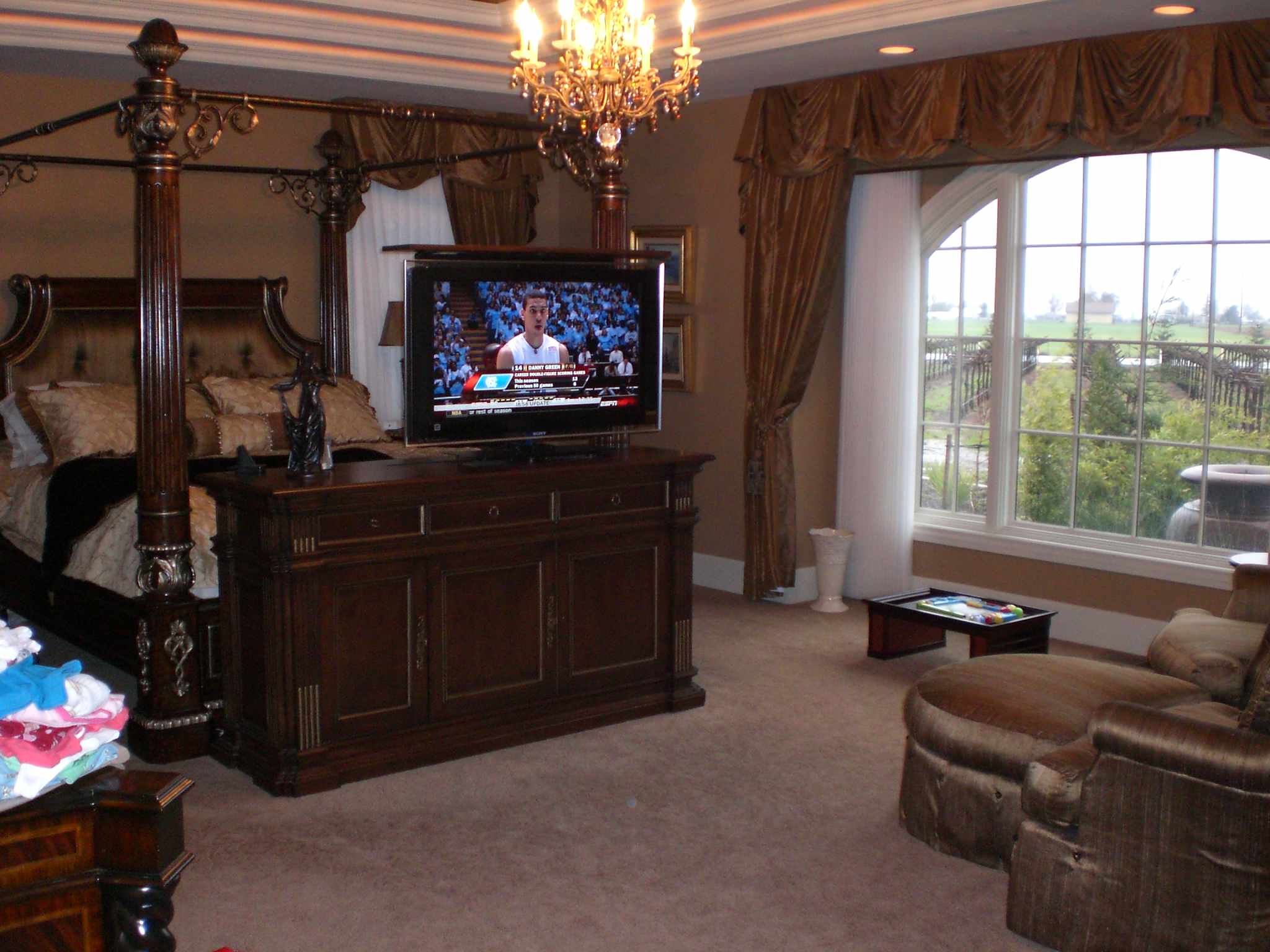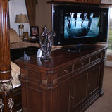 Tv lifts can be added to a custom made piece of furniture to electronically lift and lower the tv to create additional space, protect equipment from damage when it's not in use.