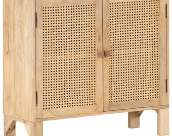 The cane cabinet features one swinging door that hides inside storage of four shelves.