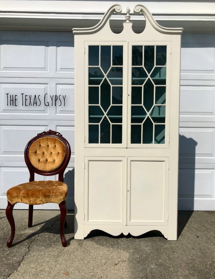 White corner cabinet with doors, tiny lucite/gold.